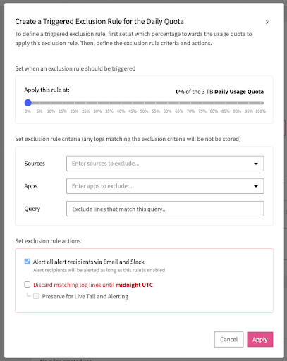 At its most basic level, Usage Quotas let you set a daily or monthly hard limit on the volume of logs stored in Mezmo. As you approach your daily or monthly limit, you can specify a threshold at which to stop retaining logs. After that threshold is hit, any logs that pass through the system will still be displayed in Live Tail and will trigger any relevant Alerts, but will not be stored and cannot be found in Search. And most importantly, any logs ingested after the quota is met will not be counted toward your monthly usage bill - no more surprise overages!