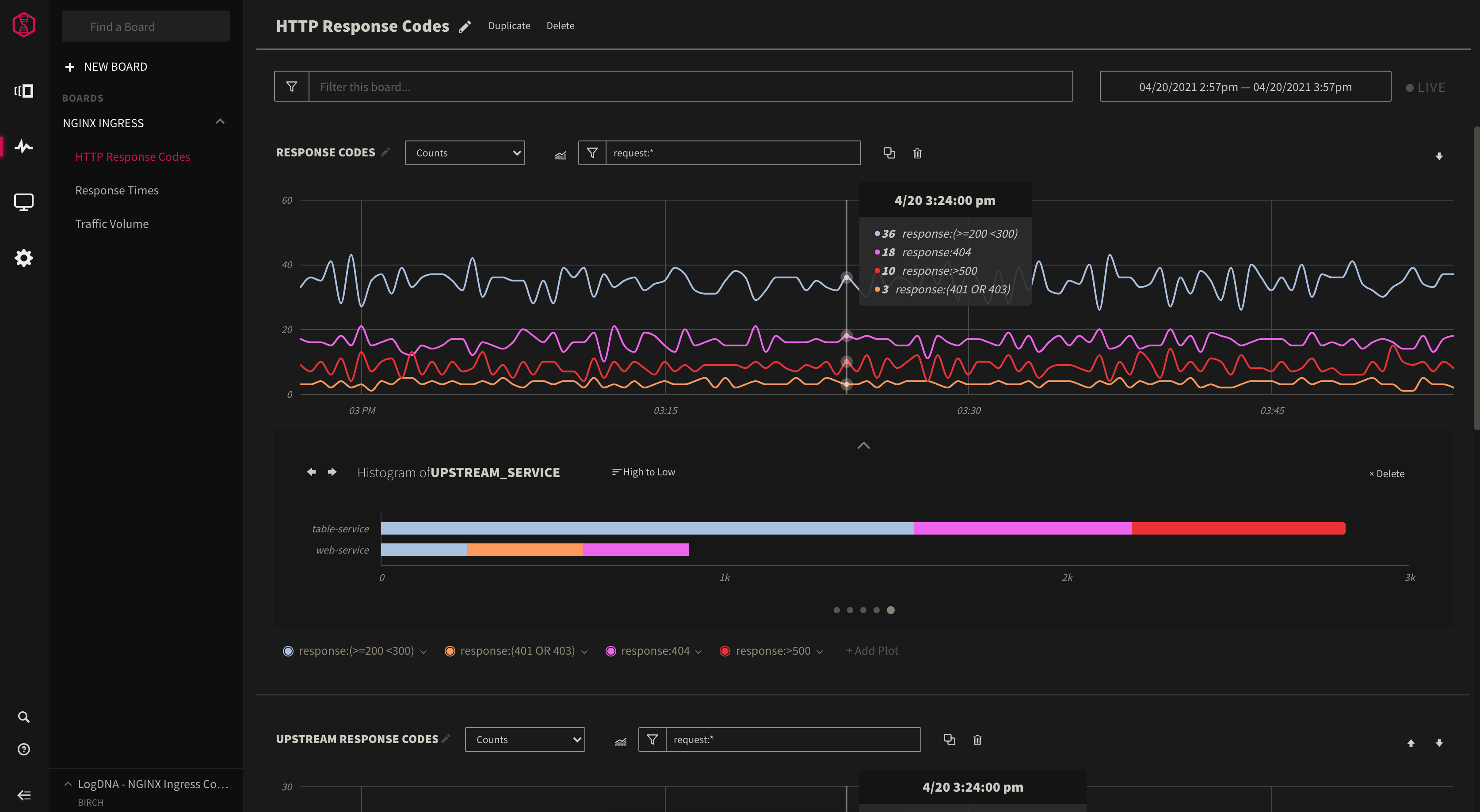 We’ve pre built Graphs for HTTP Response Codes and Traffic Volume to give you a visual representation of how your applications are responding to requests. The Traffic Volume Graph will provide singular Graphs for the total requests and bytes sent. Lastly, we’ve added a Response Times Graph in order to help you monitor and compare the response times of the request versus the upstream response.