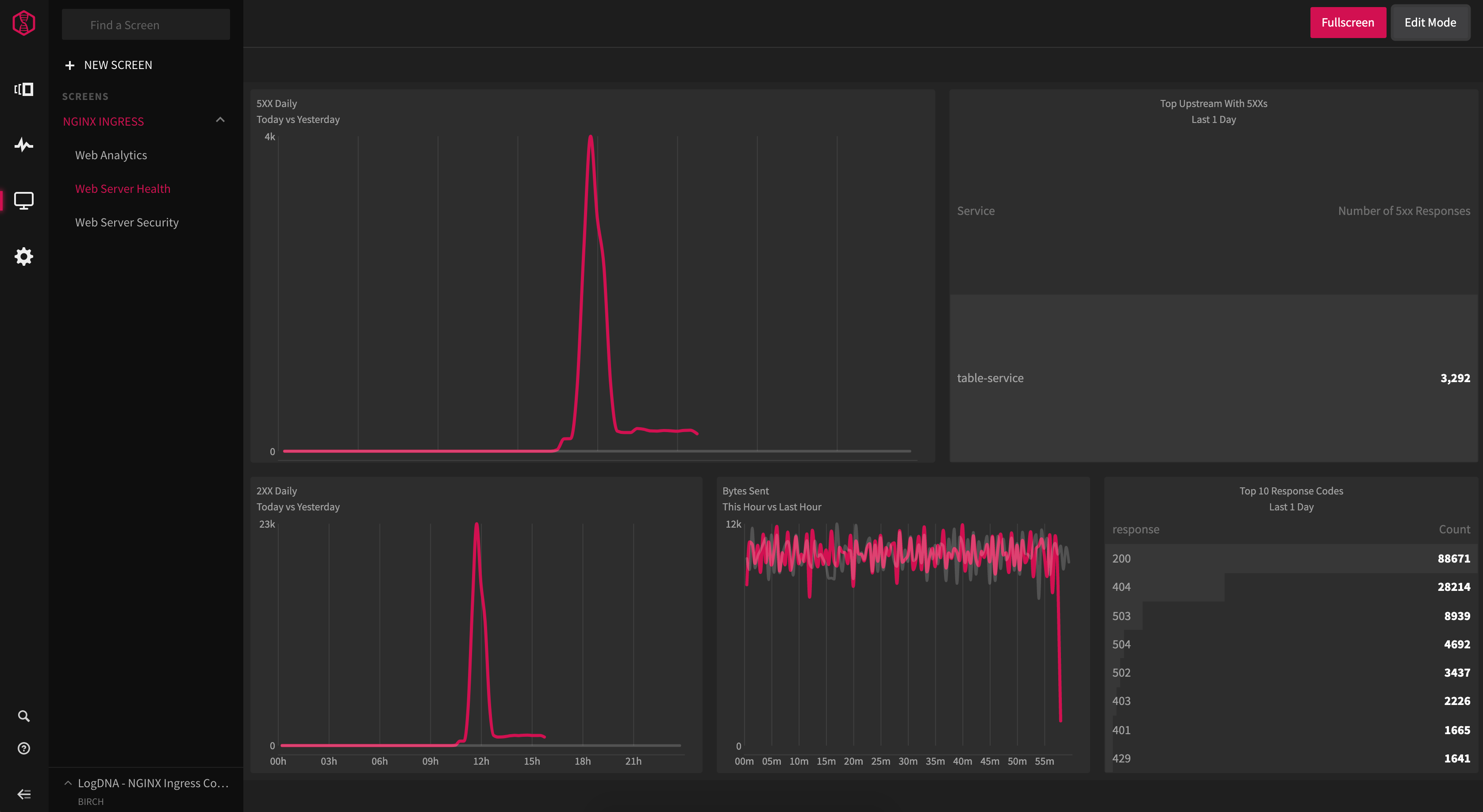 The NGINX Ingress Controller template provides a series of three Screens. The Web Analytics Screen will provide a general live updating view of traffic trends, and other popular trends. The Web Server Health Screen provides a live updated visual on the overall state of your applications responses. Lastly, the Web Server Security Screen will give you a live updating visual on Permission Denied responses, and other similar security responses such as hitting rate limits.